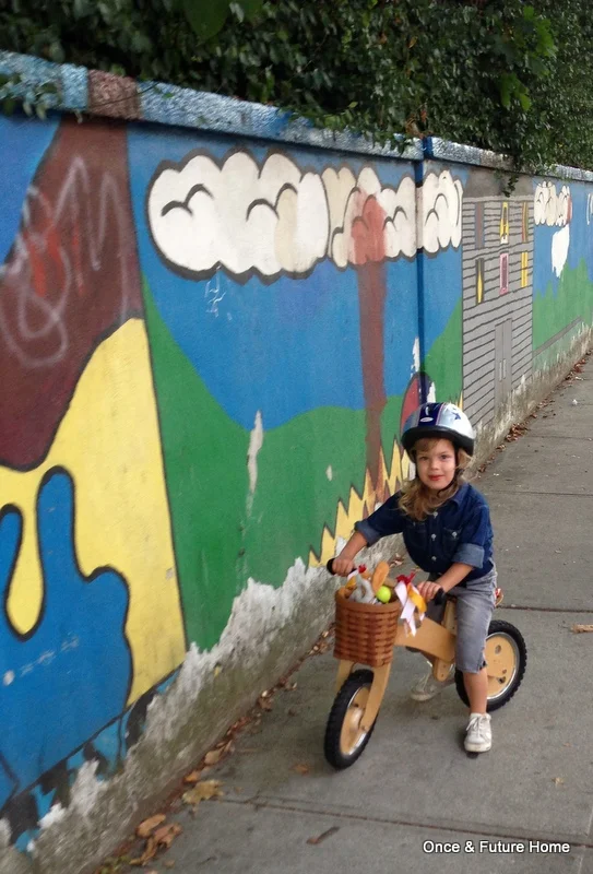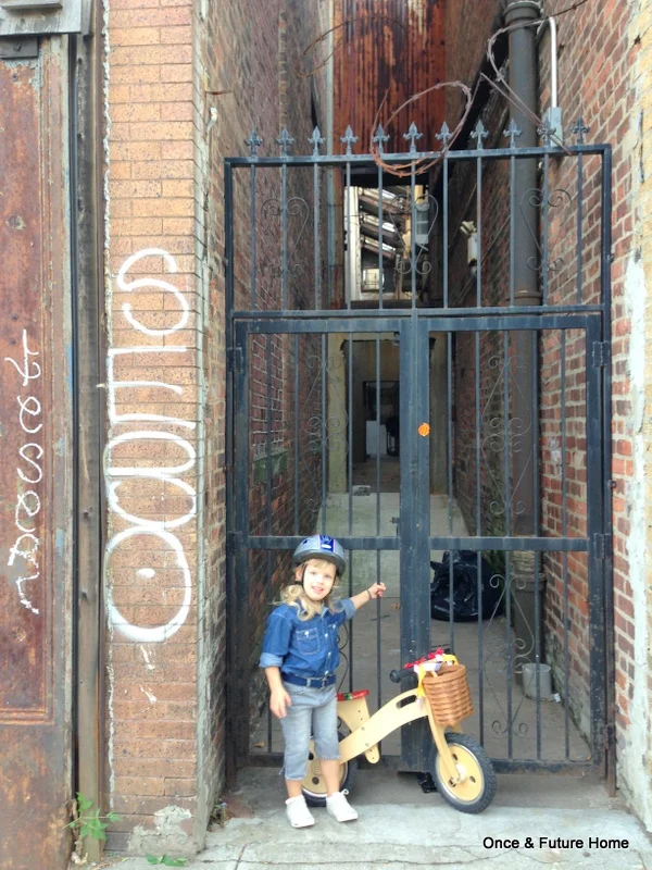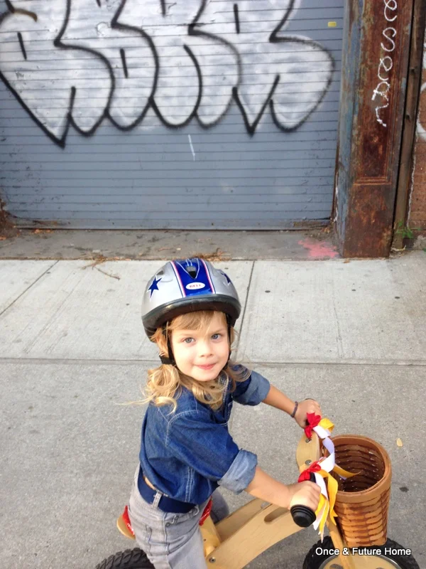 The bike itself is great for young kids. It's wooden, so I think it's sleek, and pedal-less, so Lou can be pretty quick on it, when not examining every bug, leaf and rock along the way. We got it at Goodwill in Thorndale, PA, for $8. Someone had hand-written "Deal of the Day" on the tag. Darn skippy: The bike shop a few doors down in Brooklyn sells a similar version for $300. No joke. More typically, they cost abut $75.