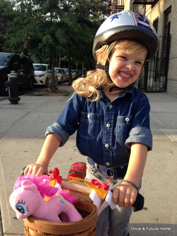 A week or so ago, Lou and I decided she needed a basket on her bike. We love her little bike, and she zips around town on it like a pro. But it has no space for Critical Items like water bottles and My Little Ponies. So we decided to remedy the situation.