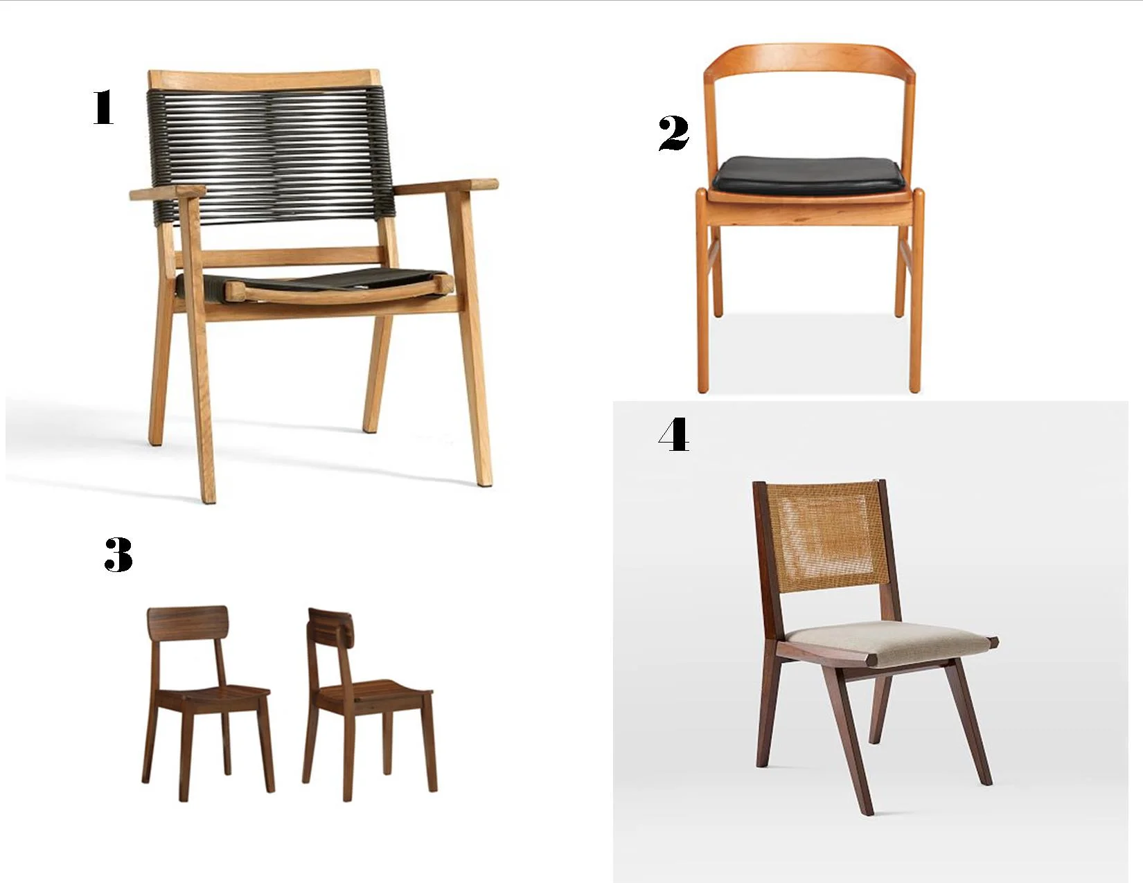 I absolutely love all of these chairs. I chose them all for their mid-century vibes - clean lines, mid-toned wood, even the rattan on the bottom chair - and think any one would make a fantastic addition to an updated dining room.