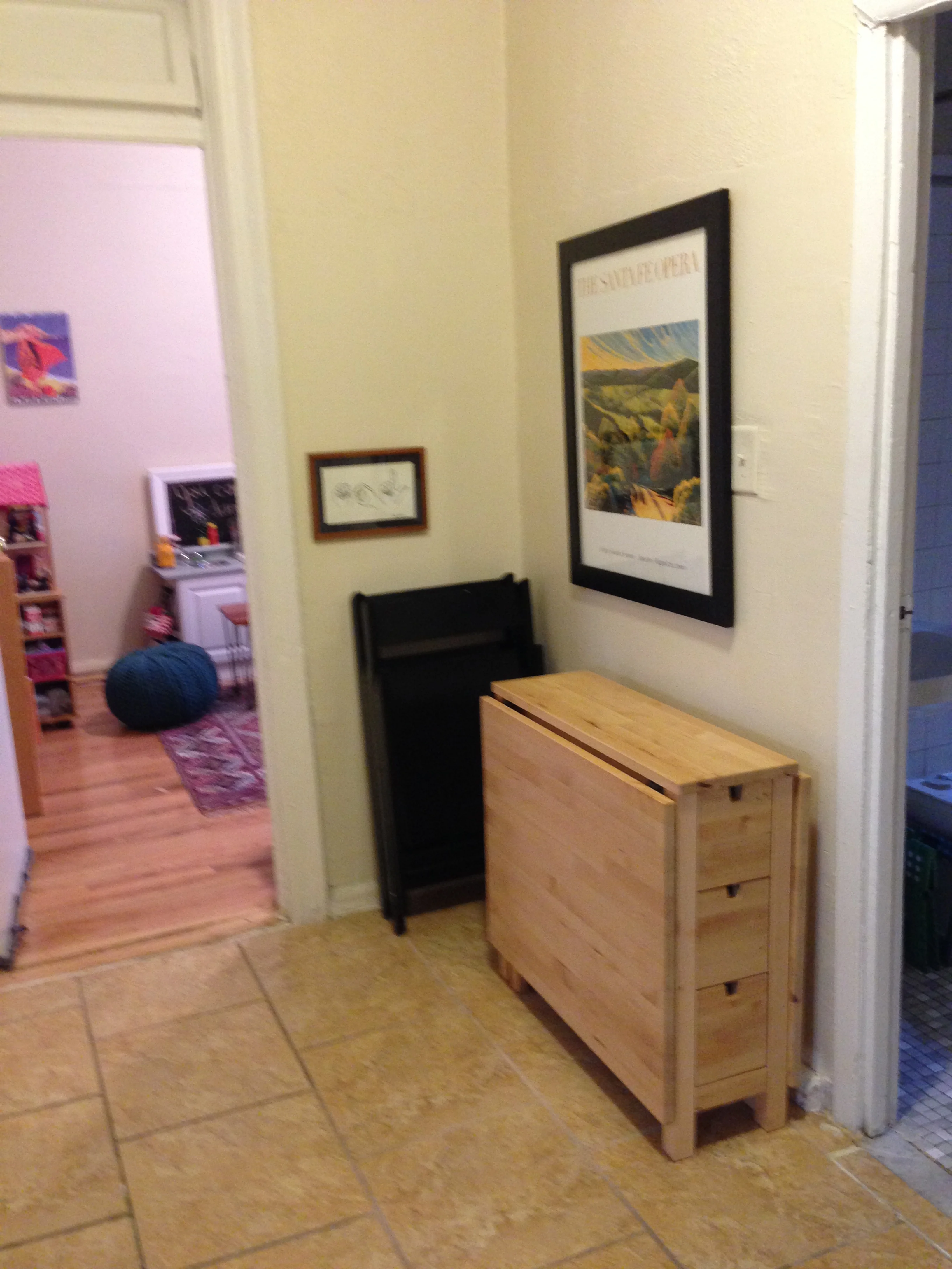Here's the other side of the hallway. When you walk in our front door, you're in a hallway, from which all of our rooms branch off. You can see the bathroom on the right of this pic and Lou's room straight ahead. We put the dining table at end of the hallway - not where our the homeowners had it, but the only place it ended up making sense for us. At mealtimes, we unfold the table, unfold those chairs, shut the bathroom door and eat.
