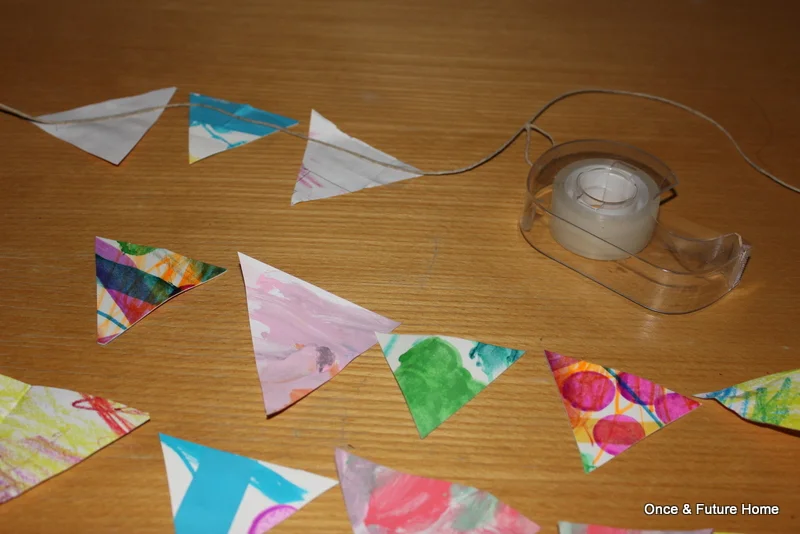 Then I very scientifically cut out some triangles and taped them to a bit of twine. I used hot glue to stick the banner to the inside of the frame, hung the whole thing up, and called it good.
